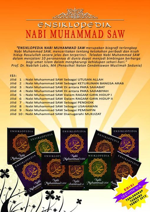Ensiklopedia Nabi Muhammad SAW merupakan biografi terlengkap Nabi Muhammad SAW, menceritakan tentang ketokohan peribadi dan kisah hidup Rasulullah secara jelas dan terperinci. Teladan Nabi Muhammad SAW dalam menjalani 10 peranannya di dunia dapat menjadi bimbingan berharga bagi umat Islam dalam mengharungi kehidupan sehari-hari. - Prof. Dr. Nabilah Lubis, MA (Penasihat Ikatan Cendekiawan Muslimah Sedunia)